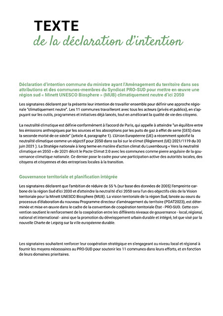 Die PRO-SUD-Mitgliedsgemeinden erklären damit ihre Absicht, gemeinsam an der Festlegung eines „klimaneutralen“ regionalen Ansatzes zu arbeiten. Die 11 Gemeinden der Südregion (Bettemburg, Differdingen, Düdelingen, Esch-Alzette, Käerjeng, Kayl, Monnerich, Petingen, Rümelingen, Sanem und Schifflingen) werden mit allen (privaten und öffentlichen) Akteuren zusammenarbeiten und dabei auf bereits gestartete Instrumente, Programme und Initiativen zurückgreifen und gleichzeitig die Lebensqualität der Bürger verbessern.