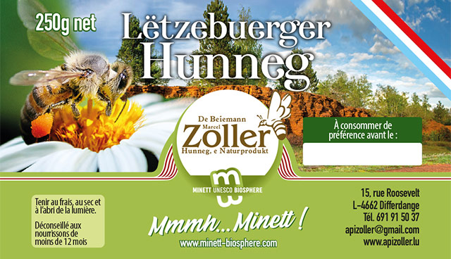Der Imker Marcel Zoller aus Differdingen wollte die Marke „Mmmh…Minett!“ verwenden, um seine Etiketten für Honiggläser zu erneuern! Wir haben also mit ihm zusammengearbeitet, um ein maßgeschneidertes Design zu entwerfen.