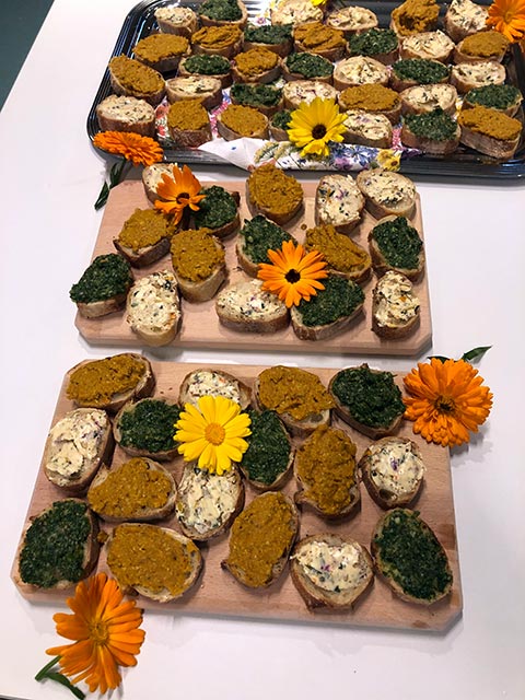 No den Explikatiounen am Bësch sinn aus de Planzen, déi vun de ronn 15 Leit fonnt goufen, eng Rei lecker Platen gezaubert ginn. Um Menü vum „Bësch schmaachen“ stoungen esou: Vullekiischte-Chutney, Wëllkraiderpesto, Gromperekichelcher mat wëlle Kraider a wëll Muertesompast.