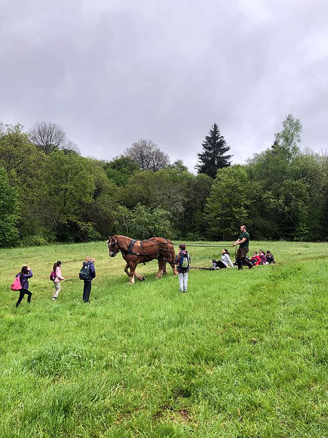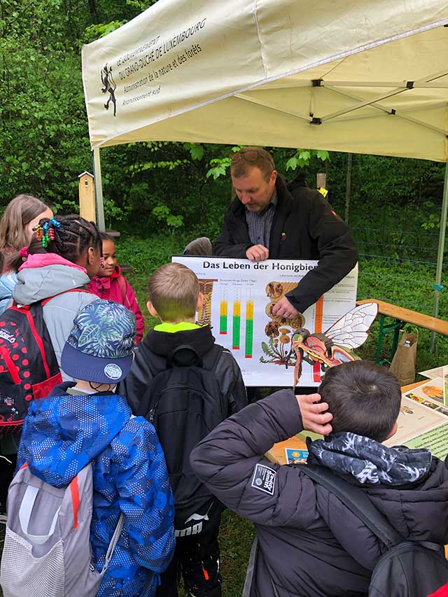Déi wichteg Roll vun de Beien als Bestëbser am Kreeslaf vun der Natur war de Sujet vun engem Atelier vun der ANF, am zweeten ANF-Atelier goung et ëm d’Minnen aus der Regioun an hir aktuell Wichtegkeet fir d’Iwwerliewe vun de Fliedermais. A schlussendlech kruten d’Schoulkanner aus der Regioun och erkläert, firwat ee Päerd ganz gutt fir Aarbechten am Bësch kann asetzen. Duerfir war d’”Robbesscheier” extra mat zwee vun hiren Ardennerpäerd vu Munzen an den Ellergronn komm.