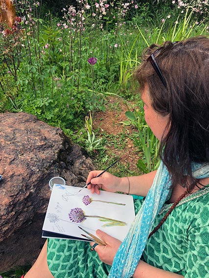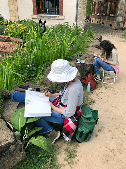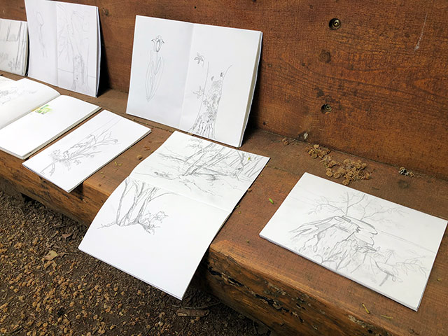 Als Opwiermübung goufen automatesch Zeechnunge gemaach, wou en eng Planz observéiert huet an dës ouni op d’Blat ze kucke gezeechent huet. Otemübungen, fir sech op de Schwong vun enger Linn ze konzentréieren, ware genee esou en Deel vum Atelier ewéi detailléiert Studie vu Bléien, déi ee ronderëm den Ellergronn fanne kann. Déi éischt Skizze goufe mam Bläistëft ausgeféiert an dono gouf mat Aquarell experimentéiert.