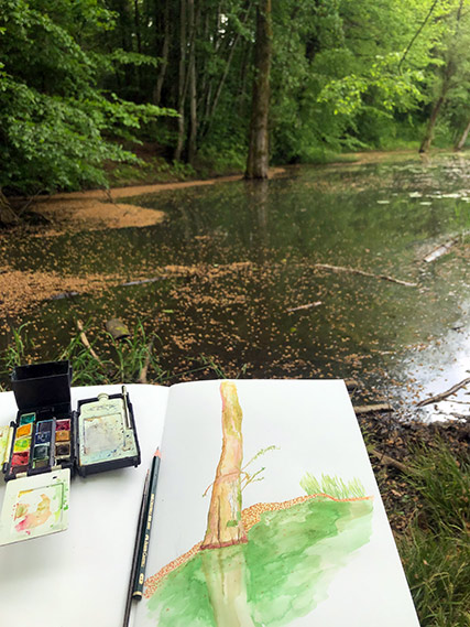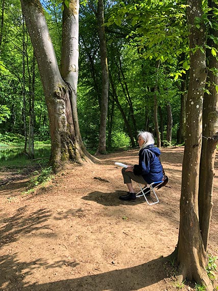 Den zweeten Deel vum Workshop war dann nieft dem „Hénzebësch-Weier“. D’Participanten hunn sech hei op déi grouss Beem konzentréiert a méi spontan a séier Zeechnunge gemaach. Den Alan Johnston huet seng Erfarungen am Beräich vun den Naturillustratioune mat de Participante gedeelt a jidderee krut individuelle Feedback vum Expert.