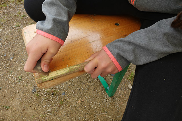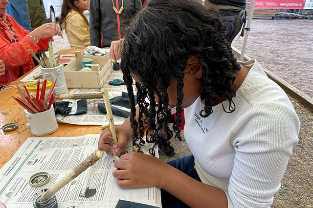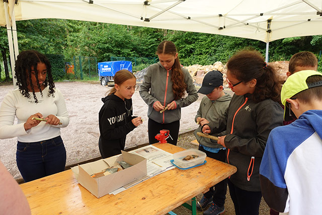 Archeologie a Geologie waren d‘Theeme beim Stand vum Musée Ferrum, wou d’Schoulklassen mat Hëllef vu Feiersteng schnëtze konnten fir duerno hiren eegen Holzbijouen ze bastelen.