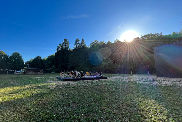 Les sujets abordés ont été nombreux. Les professions d’architecte et de forestier ont été expliquées. L’« Heure Bleue » en tant que projet artistique et moment particulier de la journée a été discutée et le caractère unique du site d’Ellergronn a également fait l’objet de la conversation, qui a été enregistrée sur la scène de l’« Heure Bleue » au petit matin du 17 juillet.