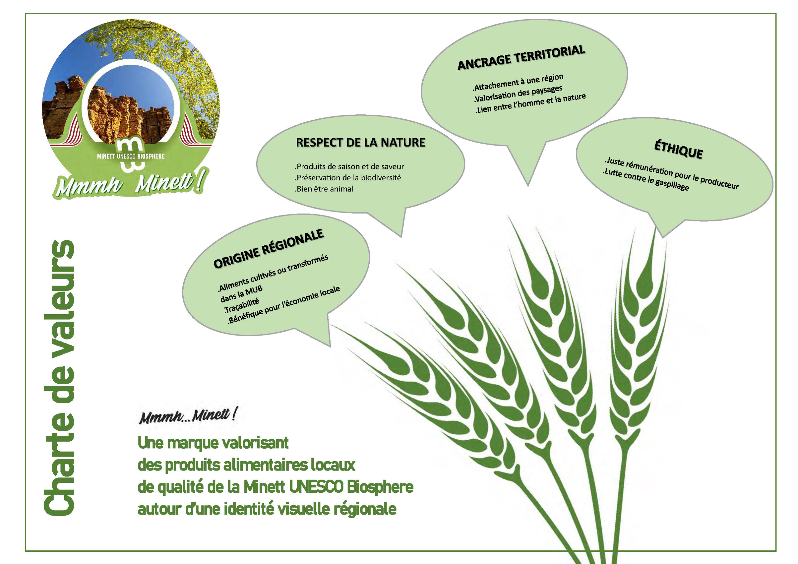 « Mmmh…Minett ! » renvoie au « consommer local » et à des idées chères aux réserves de biosphère, qui sont de repenser les relations de l’homme à la nature, de reconnecter la population à sa terre et d’en être fière, ou encore de respecter la saisonnalité en pratiquant l’anti-gaspi.
